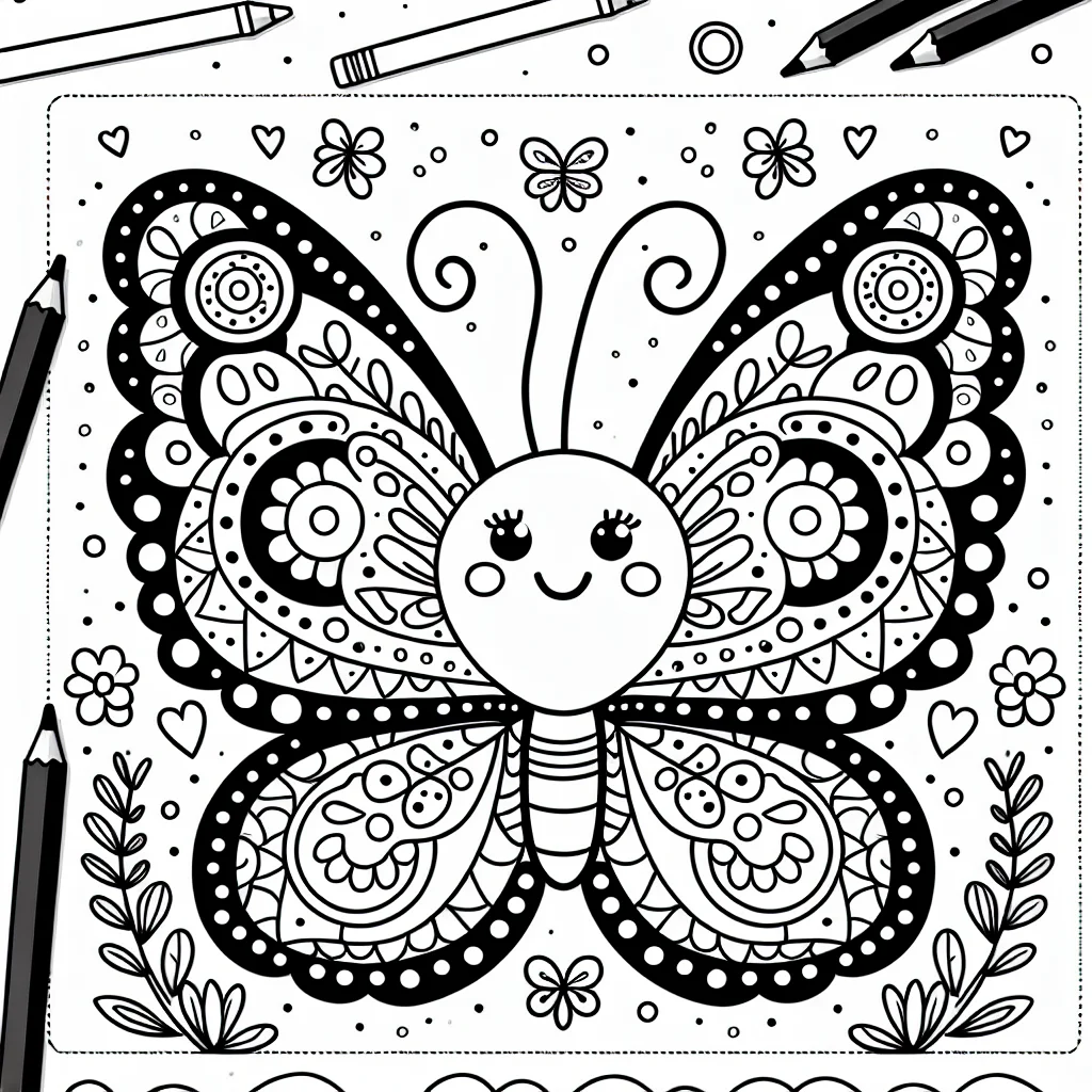 Le sourire du papillon ajoute une touche rassurante et amusante. L’enfant a l’impression de colorier un petit ami aérien. Cette dimension affective rend l’activité vraiment joyeuse.