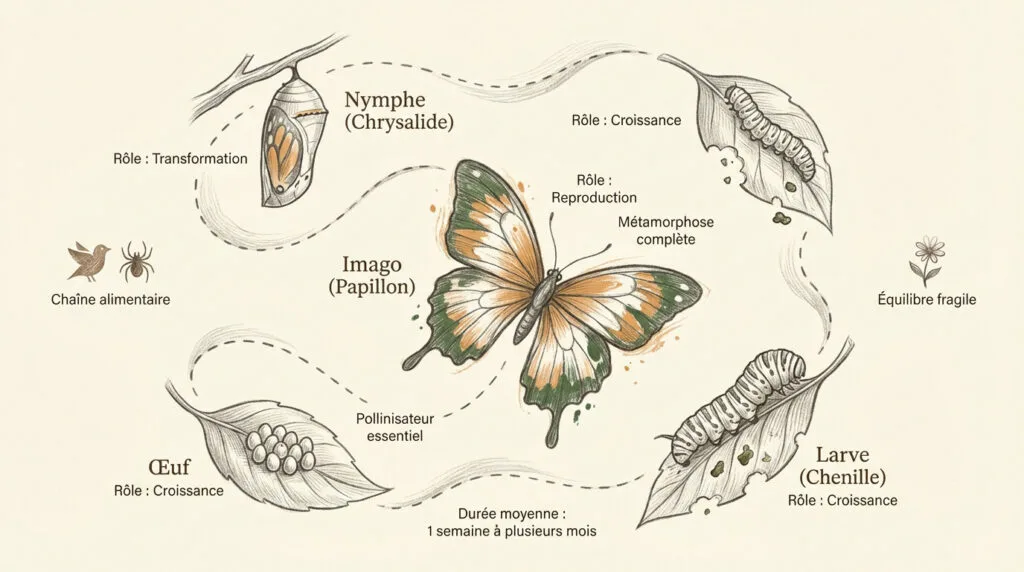 Le cycle compte quatre stades : l’œuf, la larve, la nymphe et l’imago. La larve mange, la nymphe transforme et l’adulte se reproduit. Pour en savoir plus, découvrez le cycle de vie des lépidoptères.