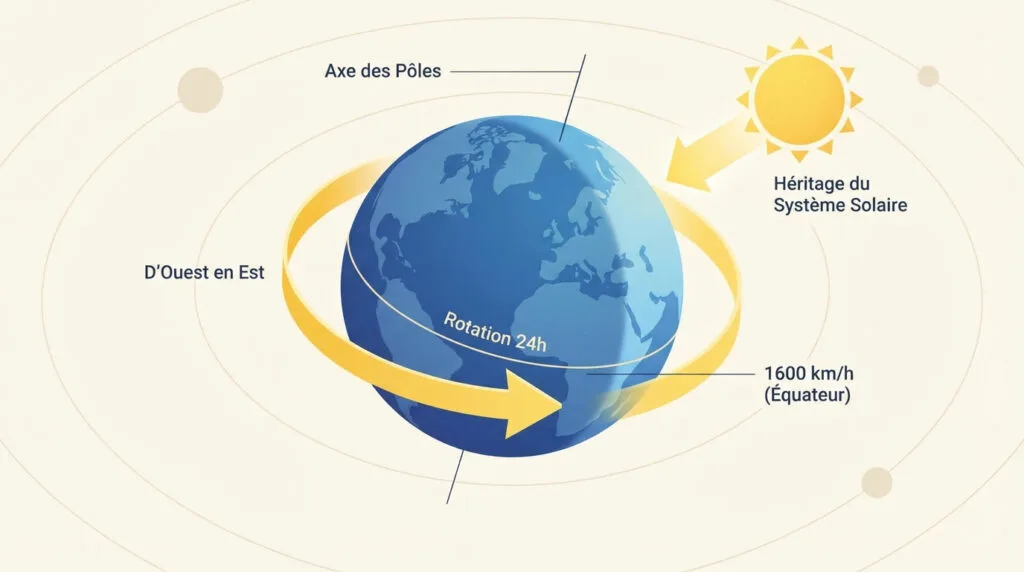 La planète tourne comme une toupie géante sur ce socle immatériel. Ce pivot dicte précisément le sens de rotation de notre monde.