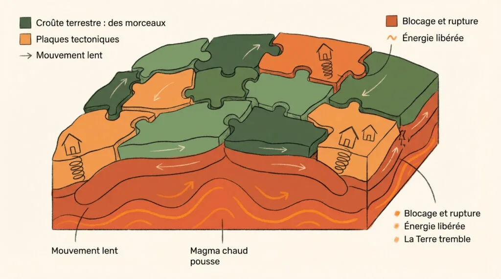 Expliquer les séismes aux enfants semble difficile quand on redoute soi-même que le sol ne se dérobe. Cet article décortique le mystère des plaques tectoniques avec des mots simples pour transformer cette peur en une leçon de géologie passionnante. Vous découvrirez comment notre planète bouge comme un puzzle géant et apprendrez les bons réflexes pour rassurer vos petits curieux en toute sérénité.